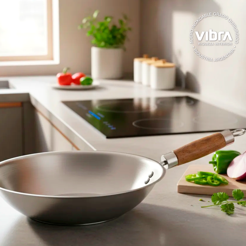 Descripción:Mango de madera 30 x 7,5 cm Este producto VIBRA ® lo diseñó en ACERO INOXIDABLE 430 apto también para cocinar por inducción. Su TRIPLE FONDO TERMO-DIFUSOR , con aluminio de 3 mm de espesor, encapsulado en acero, distribuye el calor en forma pareja, evitando las adherencias del acero común y logrando una temperatura constante en el interior de los recipientes.