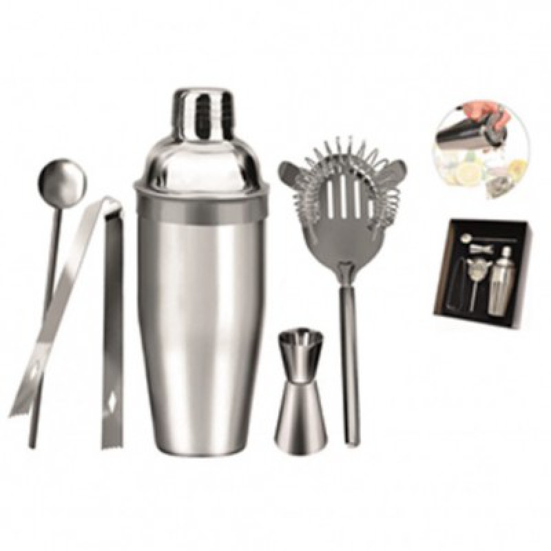 Descripción:SET DE 5 PIEZAS PARA BAR COCTELERÍA Y BAR PROFESIONAL TODO EN ACERO INOXIDABLE 1-Coctelera de acero 550cc profesional. Tapa con medida y filtro. 2- Vaso de medida doble de 7 cm de alto (1 onza y media. 3-Pinza para hielo 16 cm de largo. 4- Colador oruga 14 cm de largo. 5- Cuchara mezcladora 19 cm de largo. 6- Caja de regalo. ORIGEN: China